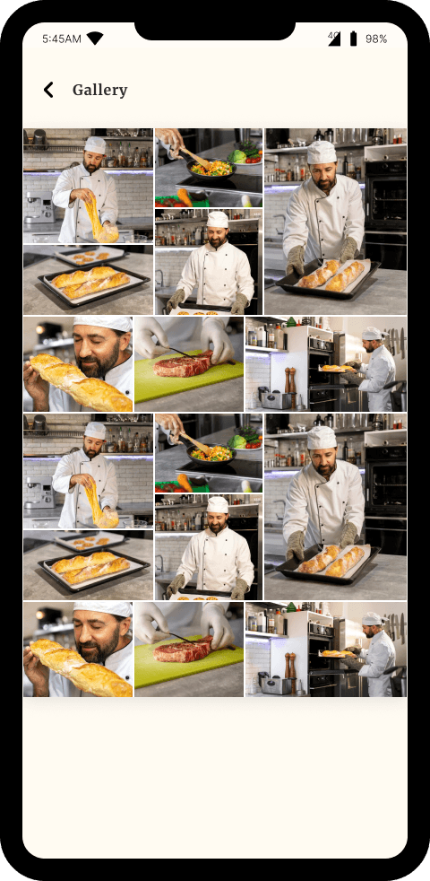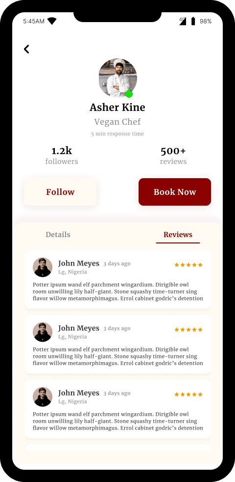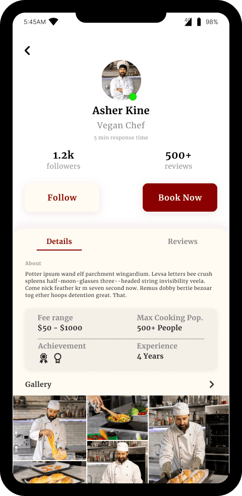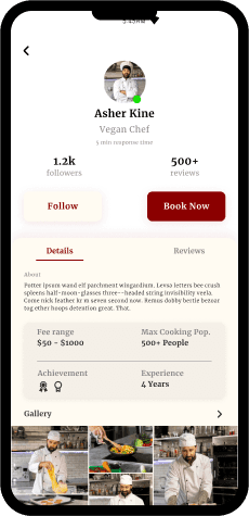 Profile of chef showing pictures, bio, achievement, rating, price range, reviews, recommendation and experience level