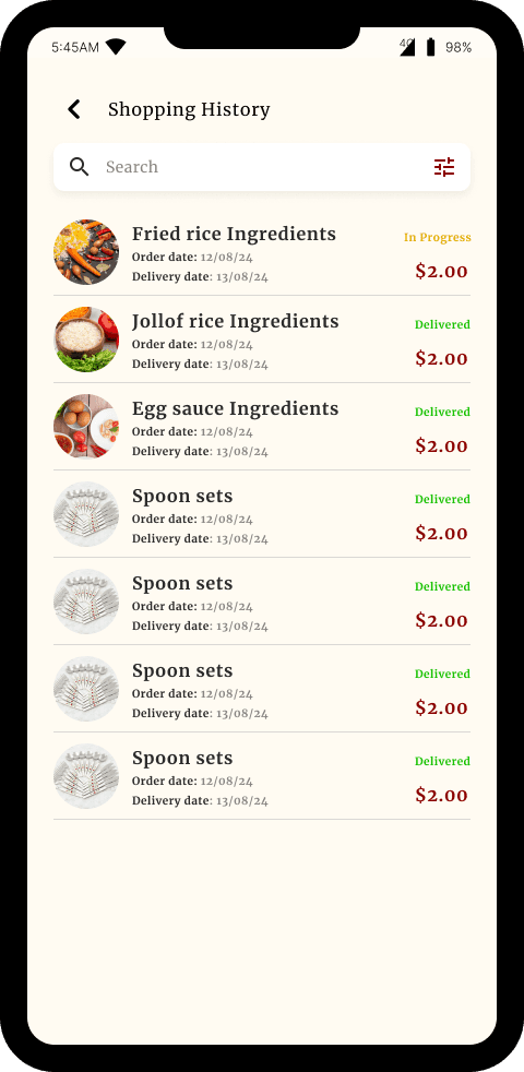 Images of food, stating the category, delivery time and delivery location